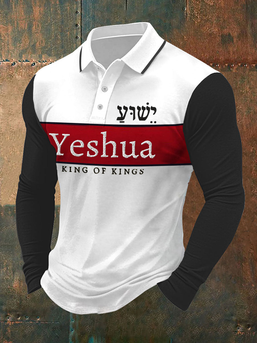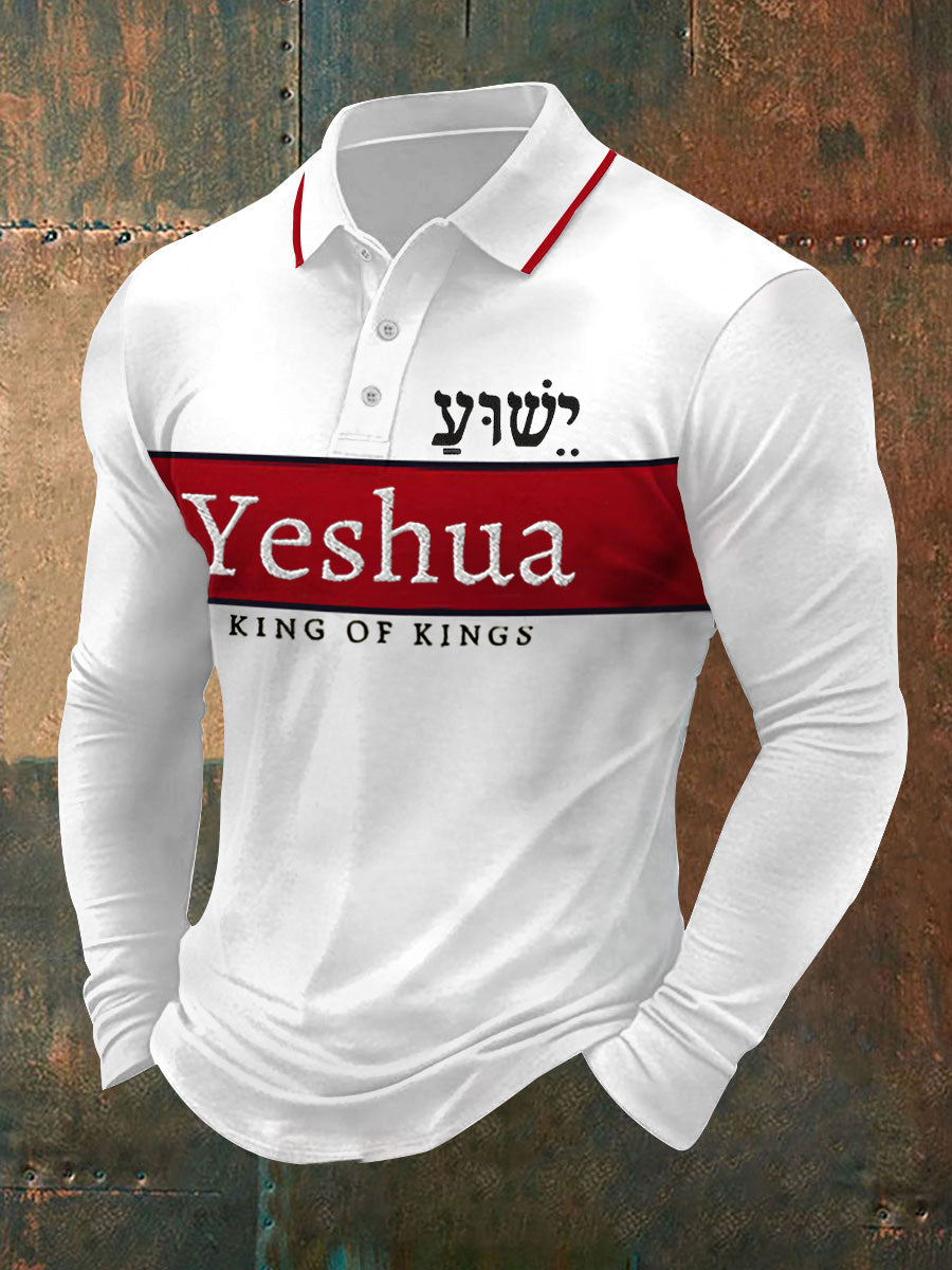 Herren-POLO-T-Shirt mit Bibelvers „Yeshua, König der Könige, Herr der Herren“, bedruckt, langärmelig