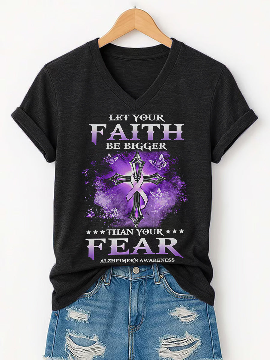 Damen-T-Shirt mit V-Ausschnitt „Lass deinen Glauben größer sein als deine Angst“