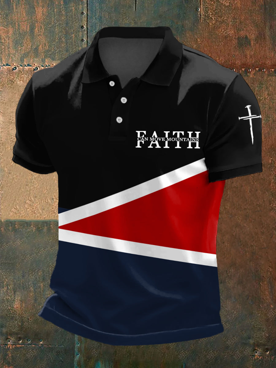 Polo décontracté à imprimé colorblock pour homme, « La foi peut déplacer des montagnes »
