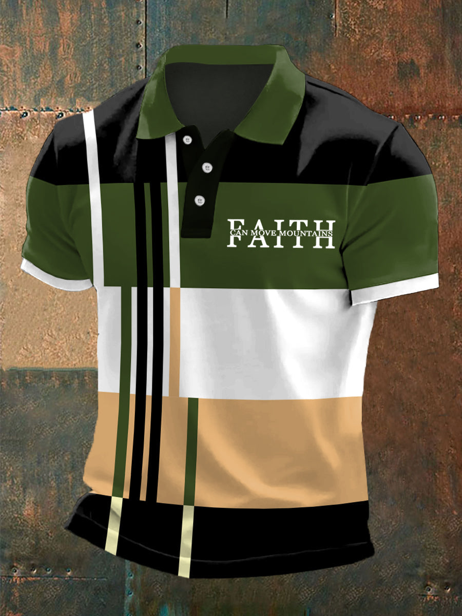 Polo décontracté à imprimé colorblock pour homme, « La foi peut déplacer des montagnes »