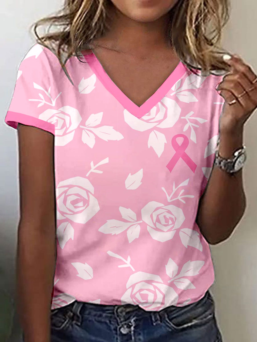 Women's Breast Cancer Awareness Pink Rose Print T-Shirt