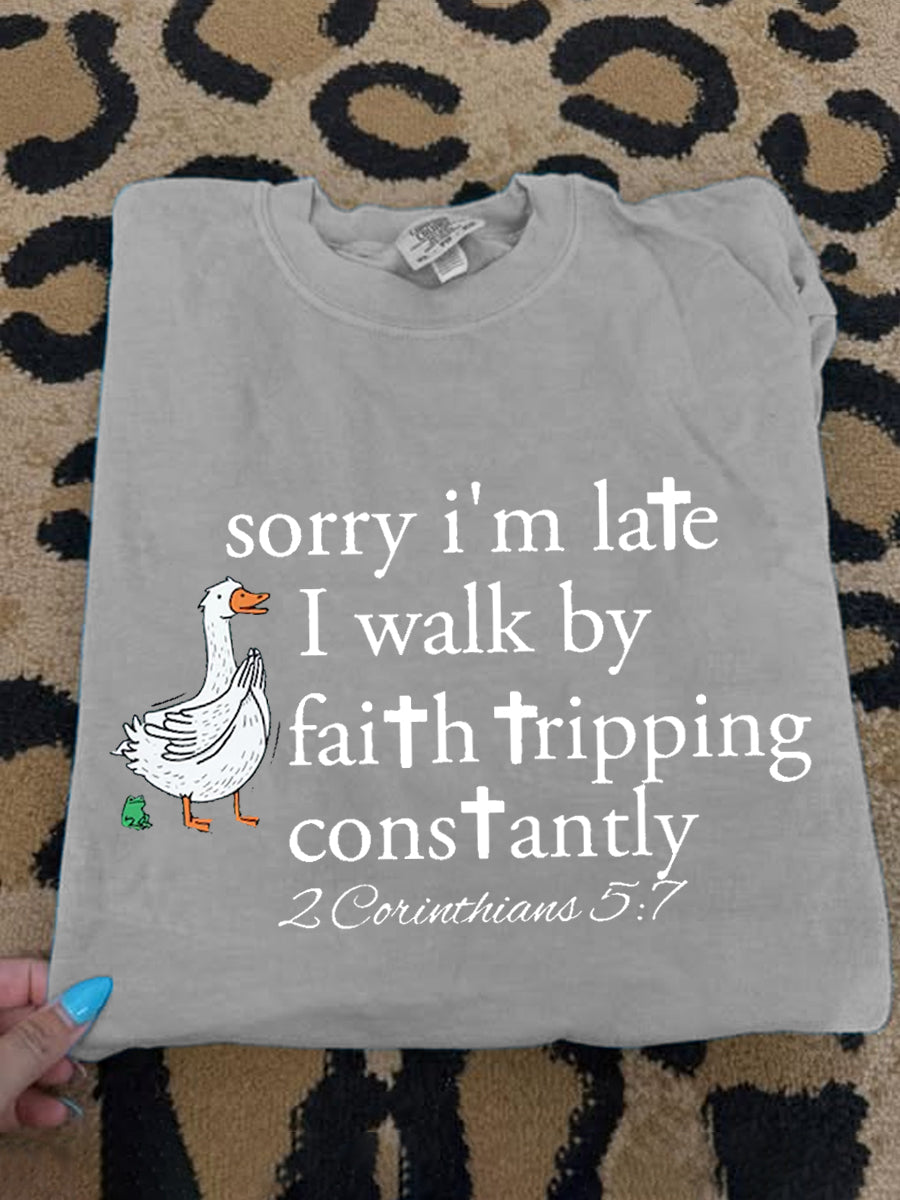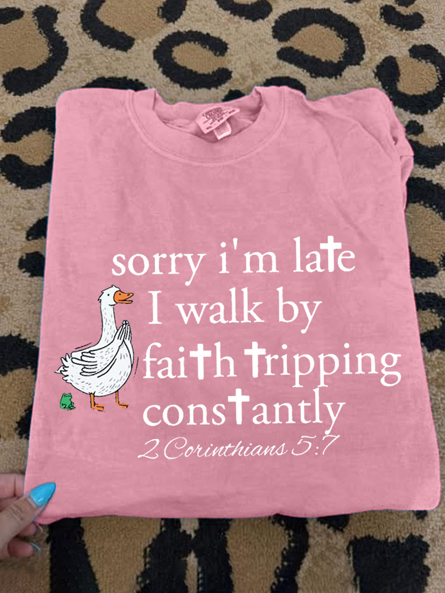 Women's Funny Sorry I’m Late I Walk By Faith Tripping Constantly Bible Verse Print Casual Tee