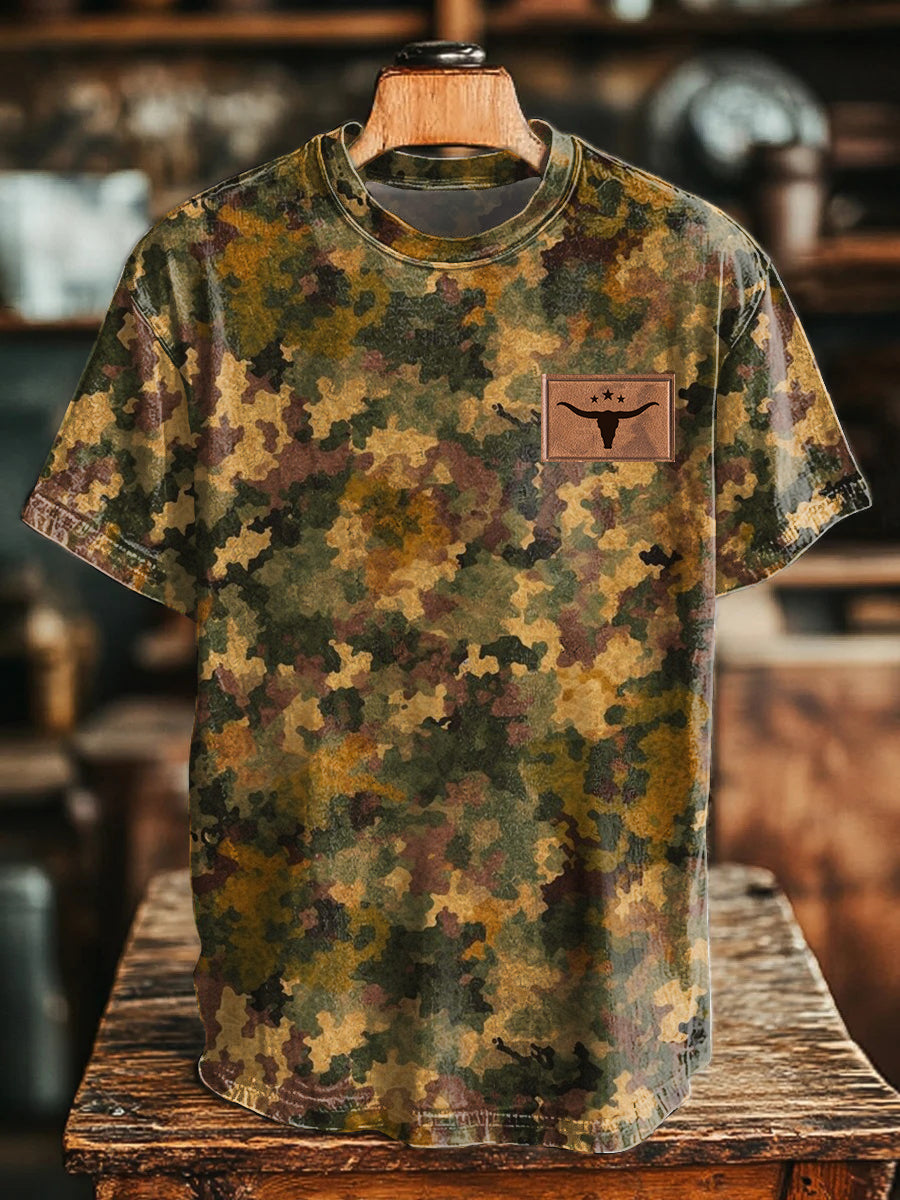Men's Retro Western Camouflage Bull Skull Print T-Shirt