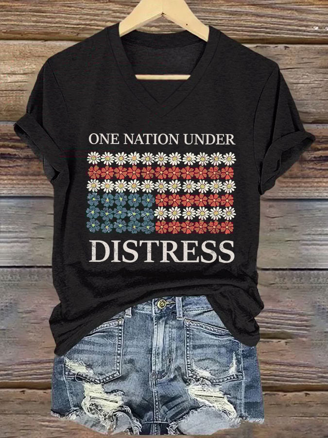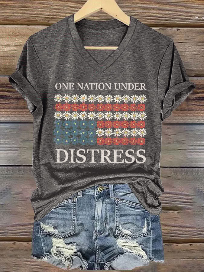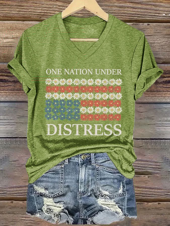 Women's V-neck Retro One Nation Under Distress Print T-Shirt