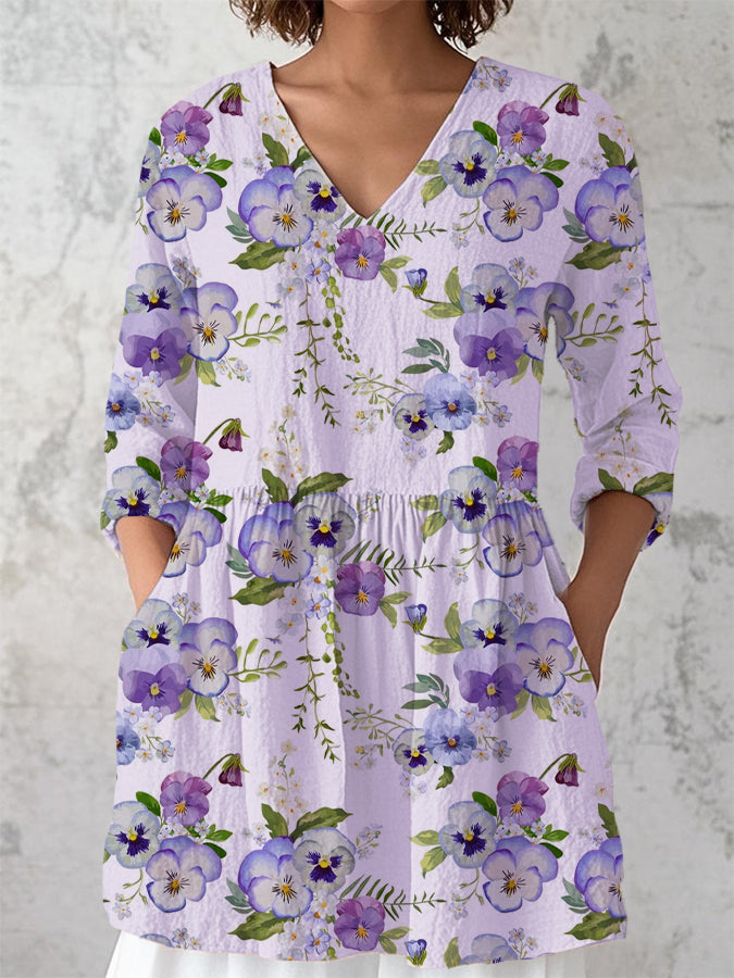 Women's Alzheimer's Awareness Purple Floral Print V-neck Cotton and linen Long Sleeve Shirt