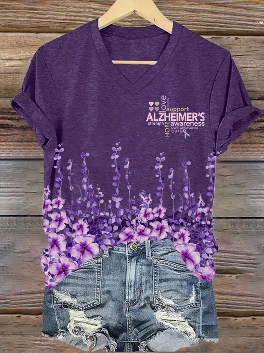Women's Alzheimer's Disease Awareness Floral Print V-Neck T-Shirt