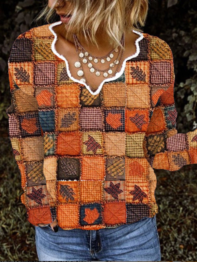 Women's Autumn plaid maple leaf  patchwork Print Top