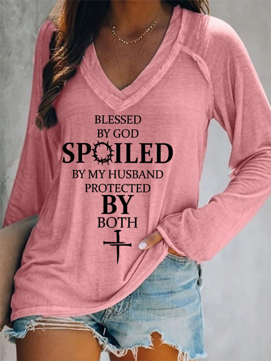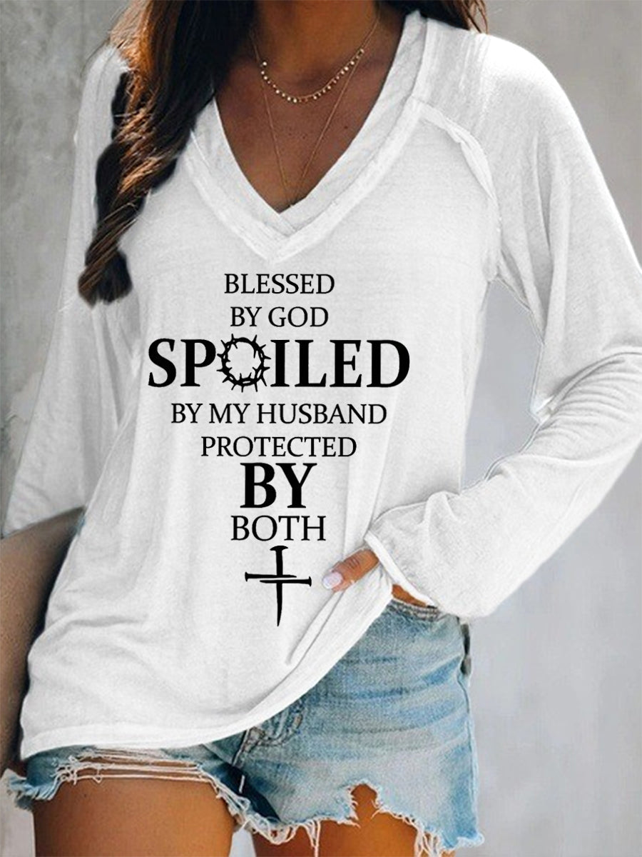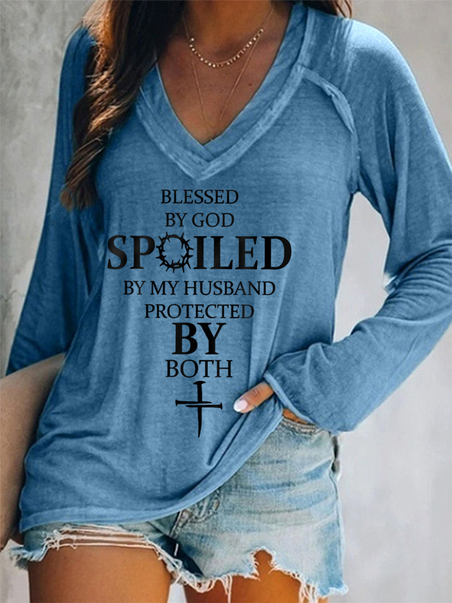 Women's Blessed By God Spoiled By My Husband Protected By Both Casual Long-Sleeve V-Neck Tee