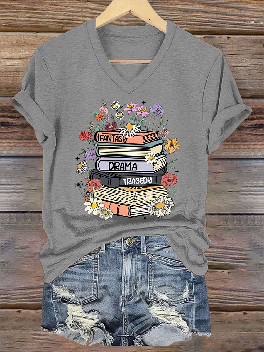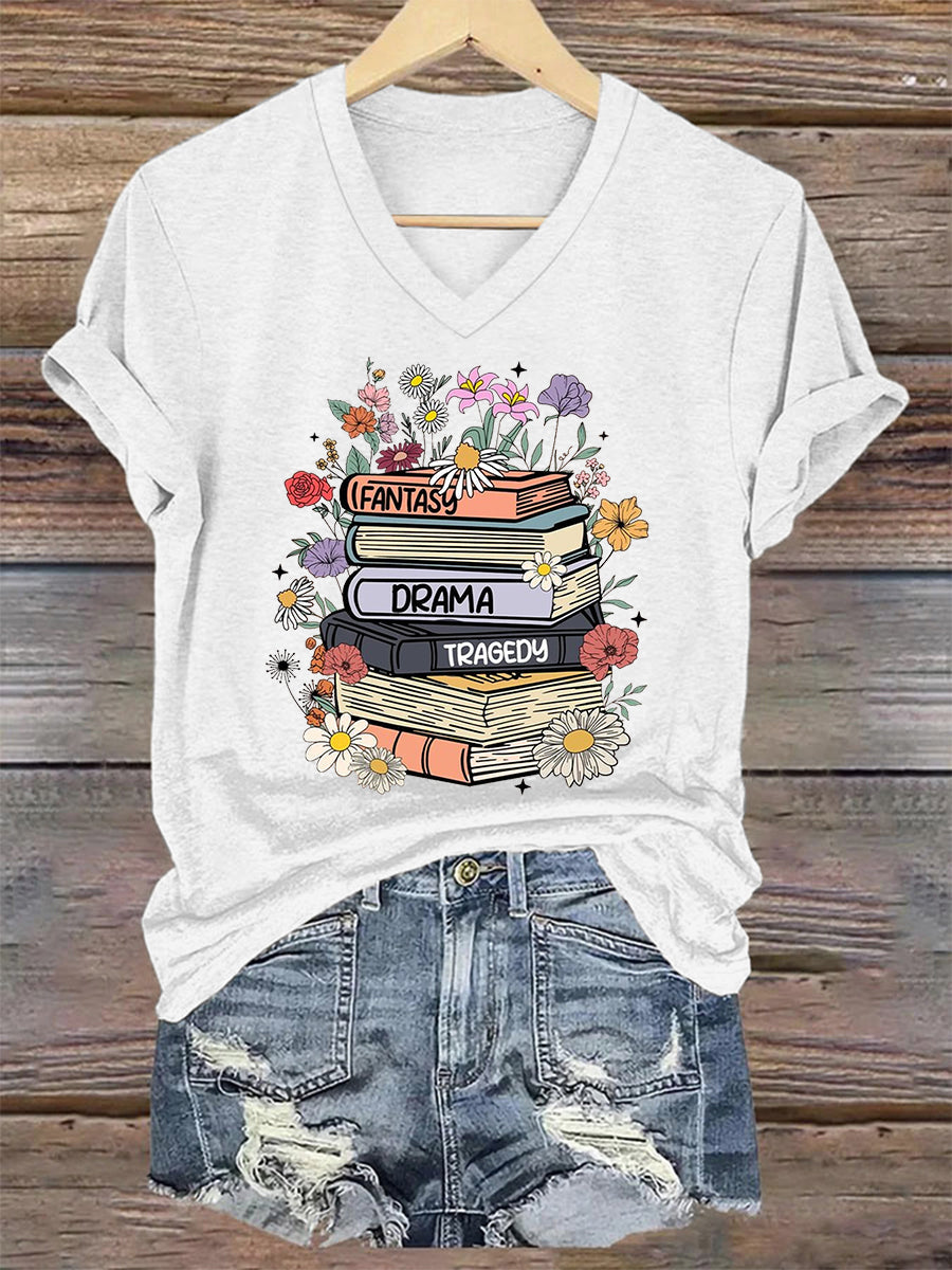 Women's Floral Book Fantasy Drama Tragedy FDT V-Neck Tee
