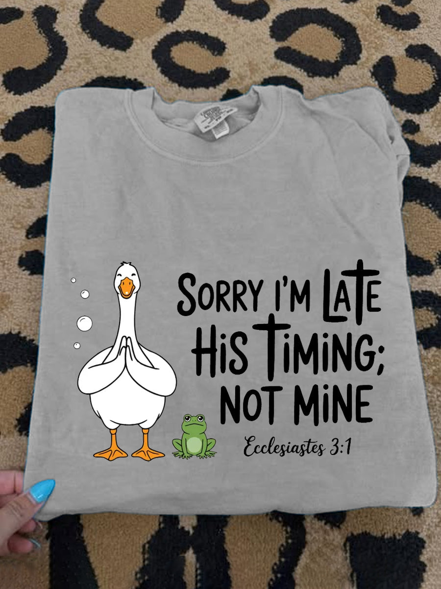 Women's Sorry I'm Late His Timing Not Mine Ecclesiastes 3:1 Funny Silly Goose Print Religious Humor Tee